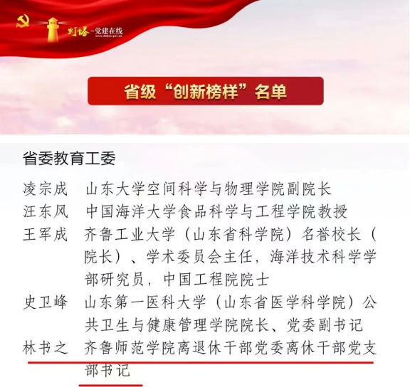 日前,山东省委组织部组织开展的“发现榜样·创新聚力在一线”专题活动“山东省创新榜样”结果公布,我校离休干部林书之光荣入选。今年91岁的林书之,1992年从新利18全站app (原山东省教育学院)副院长岗位离休。离休不离党,30年来,他始终不忘党的宗旨,保持共产党员本色,热心社会公益事业,发挥着一名老干部的余热,以自己的实际行动践行着全心全意为人民服务的初心使命。