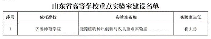 据山东省教育厅《关于公布山东省高等学校实验室体系建设名单的通知》,我校教师发展智能文科实验室获批山东省高校文科实验室,能源植物种质创新与改良重点实验室获批山东省高校重点实验室。