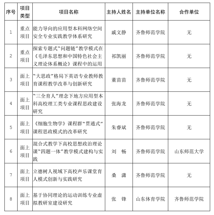 近日,2022年山东省本科教学改革研究项目立项结果公布,我校主持7项、参与1项,共计8个项目获批立项,其中重点项目2项、面上项目6项,立项率连续两年达到100%。