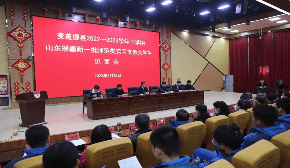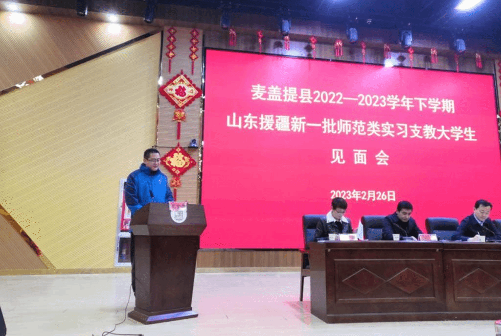 2023年2月26日,新疆麦盖提县2022-2023学年下学期山东援疆新一批师范类实习支教大学生见面会召开,新利18全站app 援疆实习支教团全体师生参加会议。麦盖提县委常委、副县长,日照援疆指挥部党委副书记、副指挥许洋出席会议并讲话,麦盖提县政协副主席、教育工委副主席、教育局党委副书记何军致辞。新利18全站app 实习支教大学生带队教师代表王通,实习支教大学生代表张新昕进行发言。会议由麦盖提县教育局党组副书记、局长玉苏甫江·艾合买提主持。