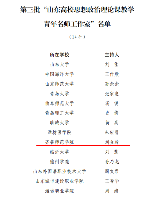 近日,中共山东省委教育工委、山东省教育厅公布了第三批“山东高校思想政治理论课教学青年名师工作室”立项名单,经专家评审、现场答辩、网络公示等环节,新利18全站app 马克思主义学院刘金玲教授主持的工作室获批立项,是全省首批14个青年名师工作室之一,系学校第二次获批省级思政课名师工作室。