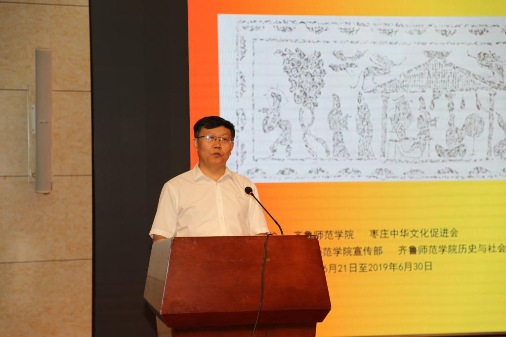 邱家和主席在讲话中代表枣庄中华文化促进会对本次展览表示热烈祝贺!他指出,素有“绣像的汉代史”之称的汉画像石,作为重要的中华文化遗存,具有极高的研究价值、欣赏价值和传承价值,是弥足珍贵的艺术瑰宝。举办这次展览,使优秀传统文化走进大学校园,传承弘扬中华优秀传统文化。希望大家通过展览,传承借鉴、汲取营养、提升文化素养,为繁荣发展我们的文化艺术事业做出贡献。