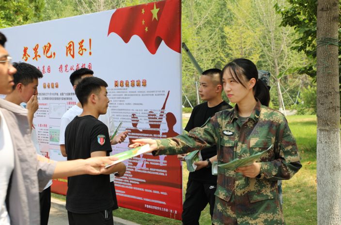 6月4日上午,我校国防教育协会的学生志愿者们在章丘校区设立了现场宣传点,现场设立了“参军吧,同学!”大型展示宣传板,通过面对面的形式,耐心细致地向同学们讲解征兵政策和入伍流程,吸引了众多同学前来咨询,现场共发放《大学生入伍政策》材料2000余份。