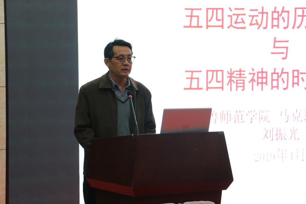 青春有故事。“国是讲坛”第三十八讲“五四运动的历史意义和时代价值”开讲。4月25日,我校“国是讲坛”举办题为“五四运动的历史意义和时代价值”的专题讲座,纪念五四运动100周年。讲座由我校马克思主义学院院长刘振光教授主讲,团委副书记赵旭辅讲,全校“青年马克思主义者培养工程”全体成员和入党积极分子近300人聆听了讲座。刘振光院长以五四精神在山东、五四精神的历史意义和时代价值以及五四精神的弘扬传承三个维度为切入点,就五四精神的时代内涵、实践意义和内在逻辑进行了全面、具体、生动的解析。深入浅出、契合实际、内涵丰富、逻辑清晰,将思想理论的大道理与学生关心关切的小切口亲密结合,在场的同学听有所触、思有所悟。