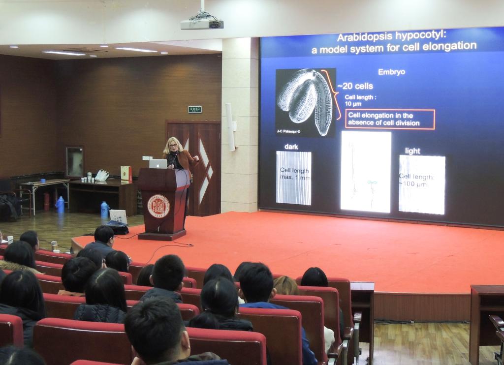 Vernhettes教授访问期间参观了我校“能源植物种质创新与改良”重点实验室,并分别与七位老师进行了充分的工作讨论。Vernhettes教授对这些老师的科研工作给予了高度评价和称赞,给出了指导性的建议。Vernhettes教授还在我校学术报告厅面向生命科学学院全体师生,作了两场题为《Organization of the cell wall during cell elongation in Arabidopsis thaliana》和《Signal pathways to control cell wall integrity during development and pathogen attack》的学术报告。重点实验室全体人员、生命科学学院学生参加了学术报告会。Vernhettes教授将植物细胞壁研究最前沿的进展和相关技术以通俗易懂的形式向我院广大师生进行了讲解,报告会后,Vernhettes教授和与会师生进行了交流,耐心详细地解答了大家的提问。