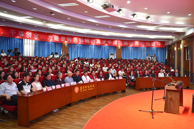 为了让同学们更加深入的了解中国古典文化,感知中国优秀文化的魅力,接受古典文化的熏陶、提高自身对中国优秀文化的认知,5月17日,由济南市文化馆、济南市非物质文化遗产保护中心主办,外国语学院承办,文学院、音乐学院协办的“中国梦·非遗行”非物质文化进校园专场活动暨新利18全站app 七十周年校庆系列活动在我校学术报告厅举行。本次活动邀请到的主讲人是济南古琴省级非遗代表传承人朱子易以及团队成员;济南章丘龙山黑陶传承人张国庆及其团队成员。文学院党总支书记魏瑞泉,外国语学院党总支书记贾国斌、教授宋秀葵,外国语学院、音乐学院团总支负责人,以及各二级学院师生代表300余人参加活动。