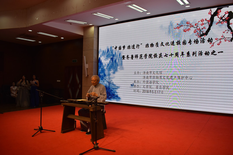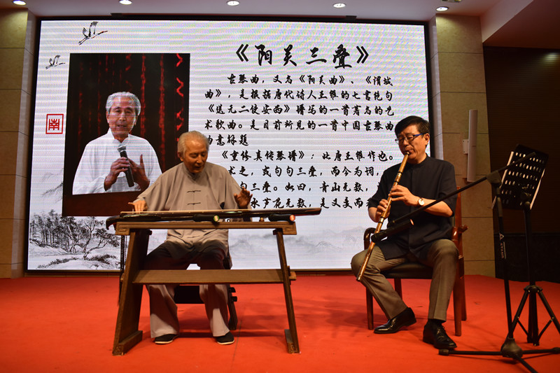 在同学们高涨的热情中,“中国梦非遗行”活动正式拉开序幕。首先,80岁高龄、诸城派古琴传人、德高望重的朱子易老先生进行了古琴的讲解。而后,朱子易又与张长弓琴箫合奏了《阳关三叠》。阵阵琴声使全场领略到了传统文化的精髓。