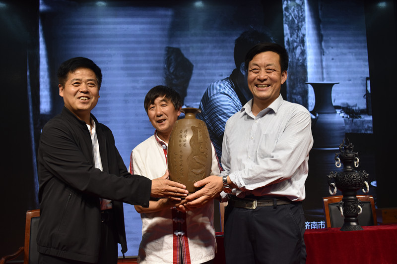 图为:外国语学院党总支书记贾国斌、文学院党总支书记魏瑞泉从章丘龙山黑陶文化传承人张国庆手中接过其团队为新利18全站app 70周年校庆现场制作的刻有“博学明道崇德象贤”校训的黑陶“贺礼”。