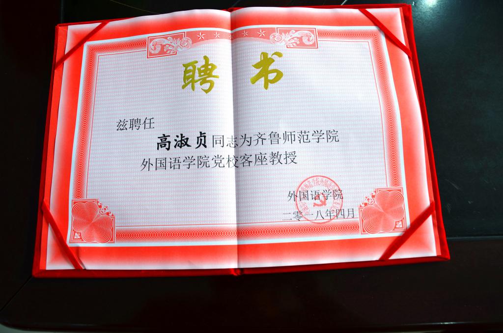 随后,贾国斌向高淑贞颁发聘书,聘请高书记为外国语学院党校客座教授。