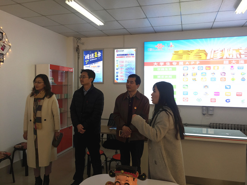 魏珂在实地视察联通未来青春创业社过程中与创业社同学进行了亲切的交流,详细咨询了同学们的创业项目和营运情况。我校学生工作处长孙磊从学校人才培养的角度介绍了学校对培养学生创新创业意识的大力举措,并介绍了学校从场地、设施、人员等方面对创业社的支持,以及创业社的其他相关工作和发展情况。