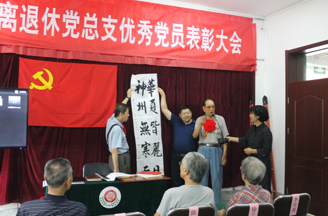 会议在庄严的国歌声中开幕,离退休处处长王跃辉首先宣读了《新利18全站app 关于表彰优秀共产党员、优秀党务工作者和先进基层党组织的决定》,处党政负责人向受表彰的徐进、张荣年、陈光苏、张桂秋、徐兰坤、李培源、赵春等7名优秀共产党员颁奖,7名优秀共产党员身披大红花,在热烈的掌声中走向主席台领奖。
