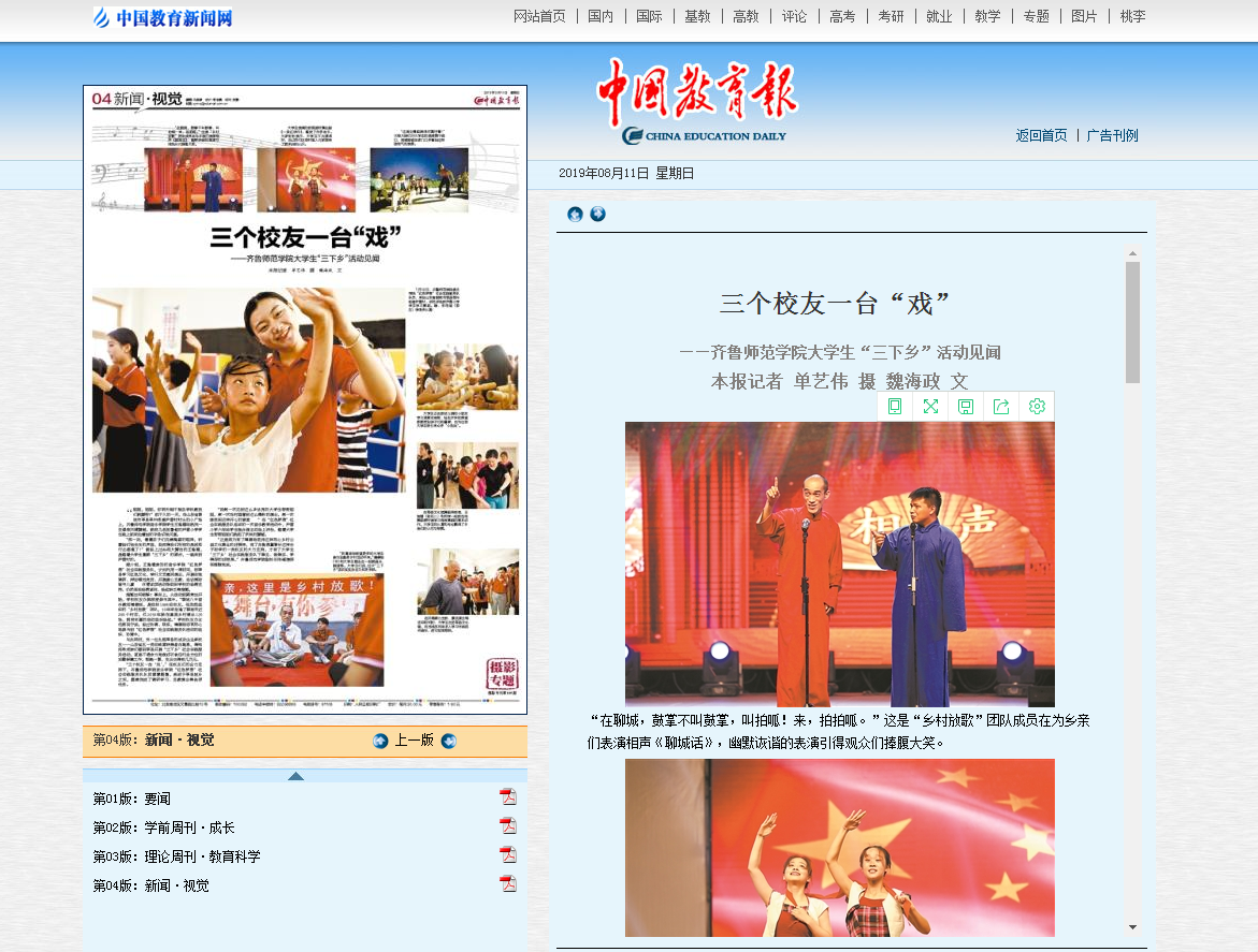 我校2019年暑期“三下乡”实践活动紧紧围绕我校“师范性、地方性、应用型”的办学定位和“教师教育、文化育人、服务地方”的办学特色,以“专项联动、主题带动、品牌驱动、课题牵动”,紧扣学生毕业要求,遵循成长成才规律,服务地方经济发展。中国教育报以三个校友一台“戏”为题整版报道了我校大学生“三下乡”活动见闻。此外,新华网、共产党员网、中国青年网、山东共青团、大众网、大众日报、山东教育新闻、齐鲁晚报、天天快报、今日头条等多家媒体从不同角度宣传报道了我校“三下乡”实践活动,提升了学校的知名度、美誉度与社会影响力。