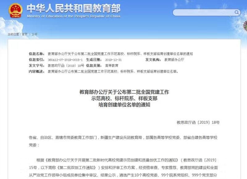 近日,《教育部办公厅关于公布第二批全国党建工作示范高校、标杆院系、样板支部培育创建单位名单的通知》(教思政厅函〔2019〕18号)在教育部官网发布。我校体育学院教师第二党支部光荣入选“全国党建工作样板支部”培育创建单位。这是我校高质量开展“不忘初心、牢记使命”主题教育的一个成果,更是教育部对我校党建和思政工作的充分肯定。
