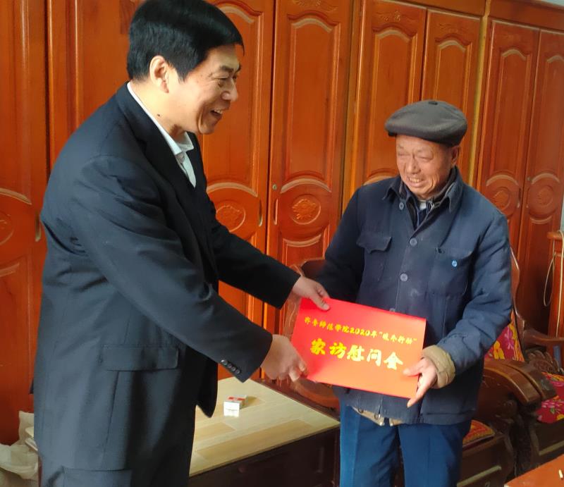 走访组首先来到学生小彭家。小彭家有四位体弱多病的老人需要赡养,弟弟上学,父母靠务农和打零工维持家计。在了解到小彭在校表现优异,多次荣获国家励志奖学金、校级奖学金和“优秀学生”荣誉称号之后,王玉华书记十分赞许她自强不息的精神,听说小彭刚刚参加了研究生考试,他高兴的鼓励小彭并预祝她考上理想学府,他说:“学校会尽力帮你克服困难、渡过难关,今后你要好好学习,孝敬父母,回报国家。”终兴镇党委书记刘爱菊仔细询问学生家庭需求,她表示:“有困难,提出来,政府一定会帮助解决。”最后,小彭激动地说到,感谢学校、感谢老师,一定不负重托,好好学习,将师院精神传承下去,奋发图强,将来回报母校,报效国家。