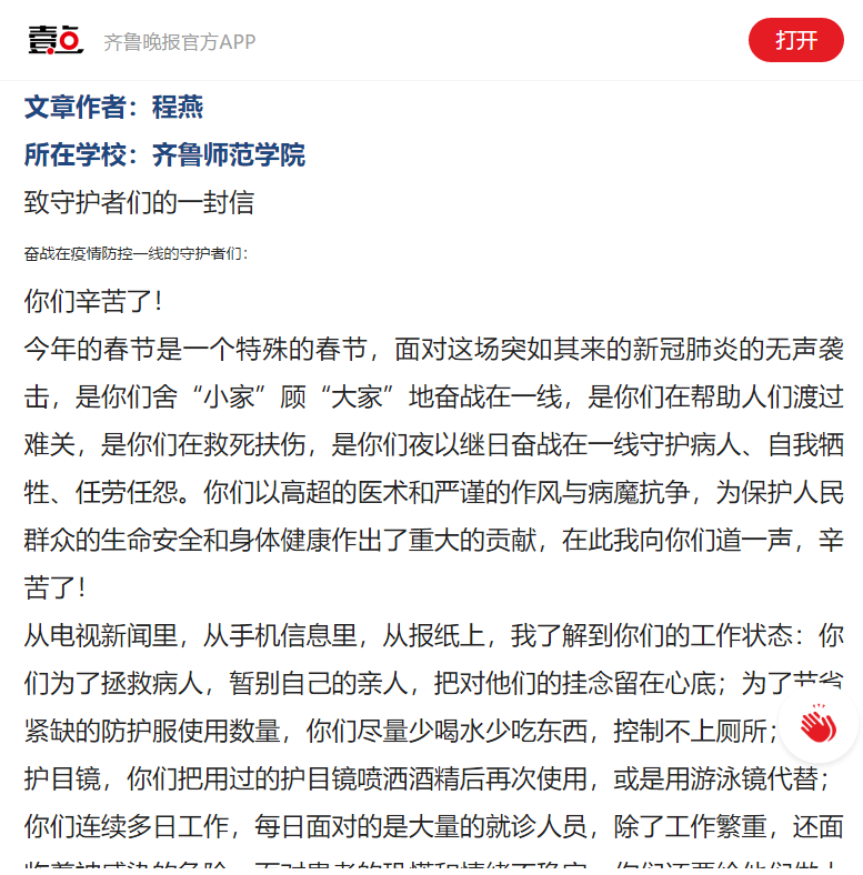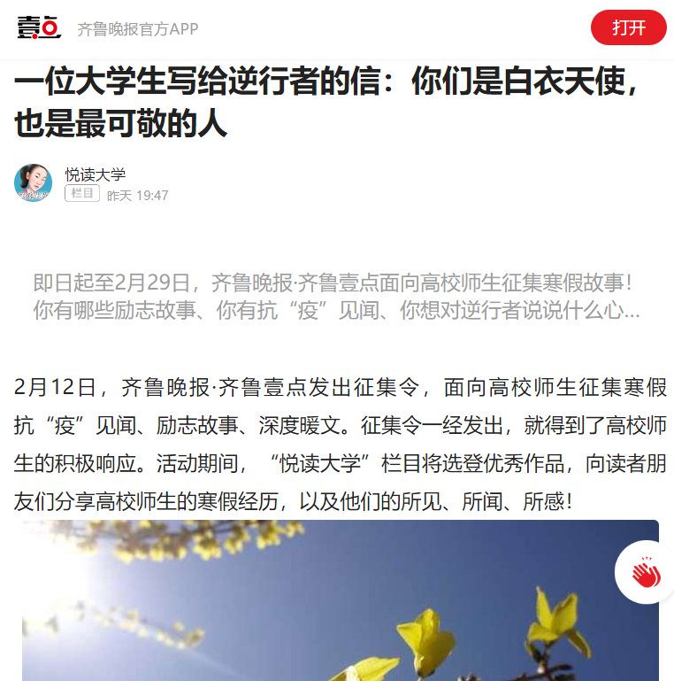 当齐鲁晚报·齐鲁壹点发出征集令,面向高校师生征集寒假抗“疫”见闻、励志故事、深度暖文。征集令一经发出,就得到了我校师生的积极响应。齐鲁晚报·齐鲁壹点“悦读大学”栏目采用了我校部分优秀作品,现予以转登。