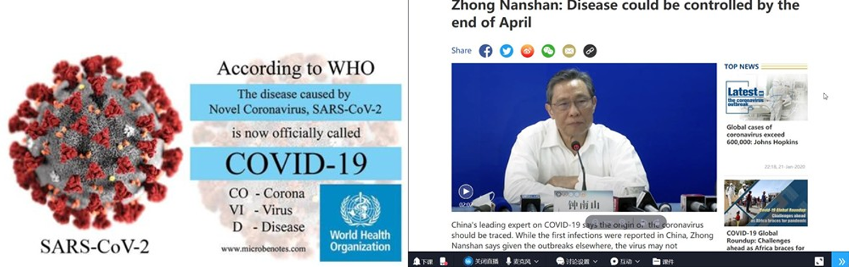 疫情期间,居家的学生们会接收到各种有关疫情的信息,这些信息鱼龙混杂,甚至不乏谣言,大大增加了学生们的焦虑情绪。大学英语线上课堂选择了讲解疫情相关词汇,播放钟南山对新冠肺炎的英语访谈,力求从科普的角度说明病毒的传播途径及防护方式,帮助学生远离不准确的“infodemic”(信息流行病),减少恐慌,保持积极乐观,做好自我防护工作,做到科学防疫。