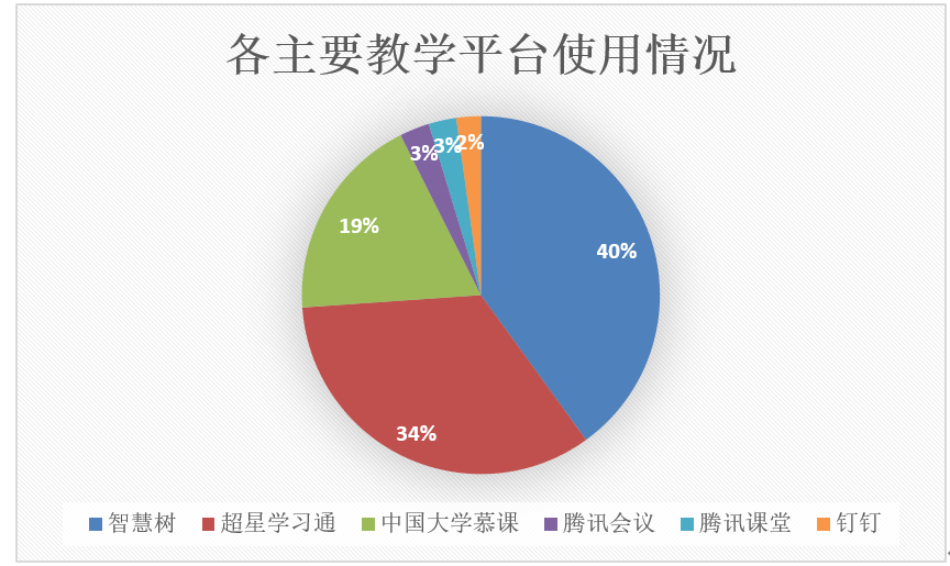 各课程自主采用超星学习通、智慧树、中国大学慕课、雨课堂、爱课程、钉钉、腾讯会议、腾讯课堂等平台开展在线教学。本学期各主要教学平台使用情况,如下图: