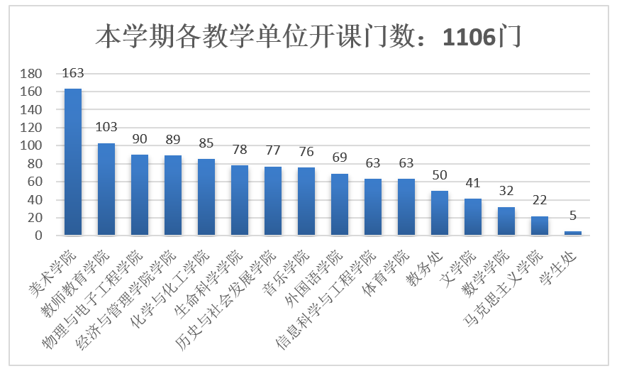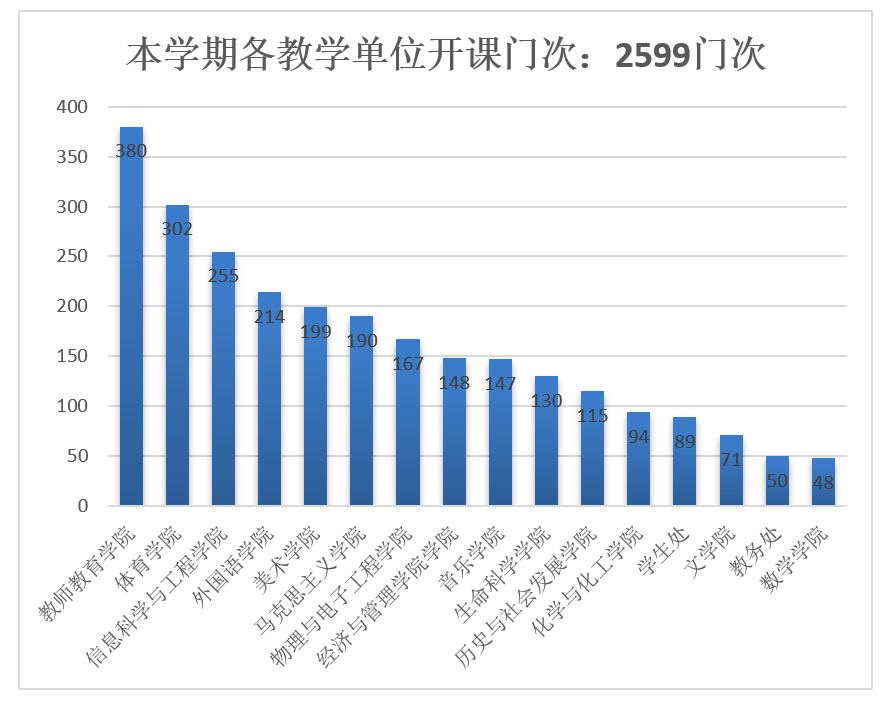 2019-2020学年度第二学期学校计划开设课程1106门,已实施线上教学课程1106门。本科开课749门,已实施线上课程749门;专科开课357门,已实施线上课程357门,开课率为100%。各类课程2599门次,参与在线授课教师608名,参与在线学习学生12905名,覆盖全校39个专业。