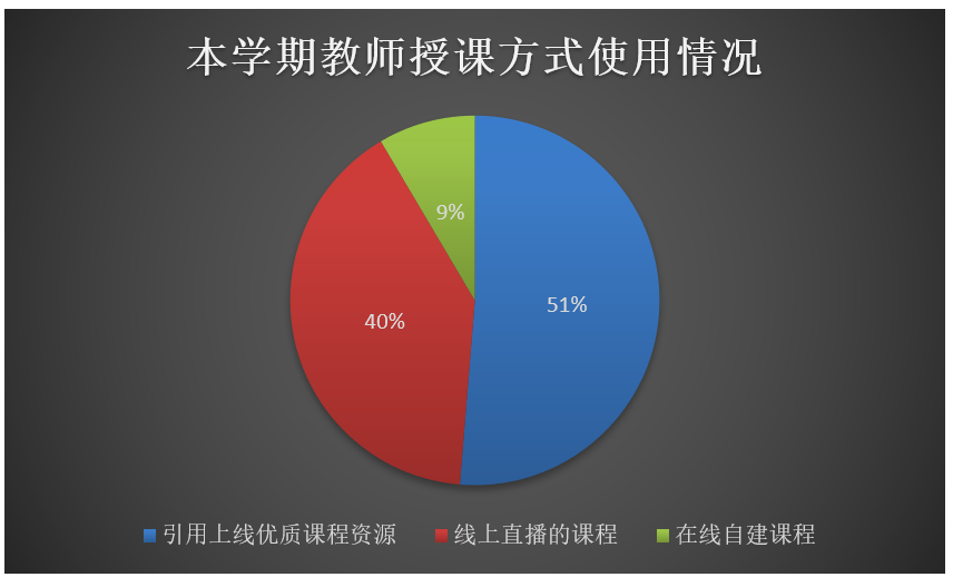 在特殊时期,我校教师用实际行动展现出人民教师在疫情面前的担当,践行着人民教师立德树人、铸魂育人的时代使命。教师们积极探索,根据学科特点、课程要求,平台已有优质资源等情况自主选择合适自己的方式开展混合式教学。在线教学方式主要基于引用已上线优质课程资源占51.3%,基于线上直播的课程占40.2%,基于在线自建课程占8.5%。