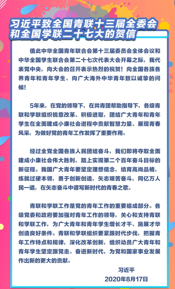 8月17日,习近平总书记向全国青联十三届全委会和全国学联二十七大发来贺电,他代表党中央向大会的召开表示热烈的祝贺,向全国各族各界青年和青年学生、向广大海外中华青年致以诚挚的问候,并鼓励寄语广大青年:坚定理想信念,培育高尚品格,练就过硬本领,勇于创新创造,矢志艰苦奋斗,同亿万人民一道,在矢志奋斗中谱写新时代的青春之歌。