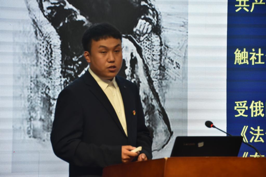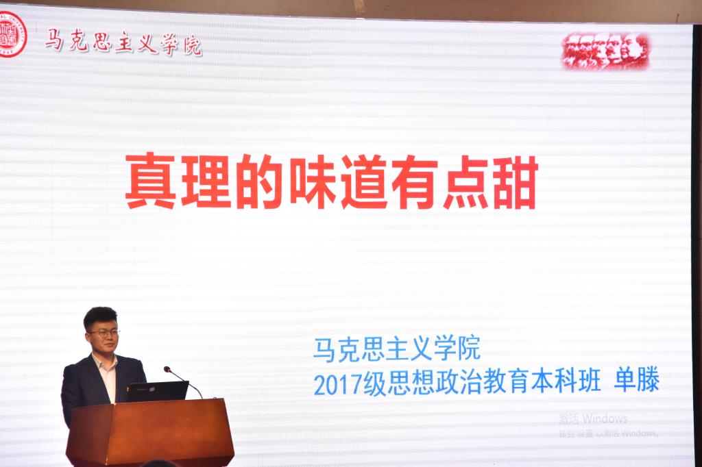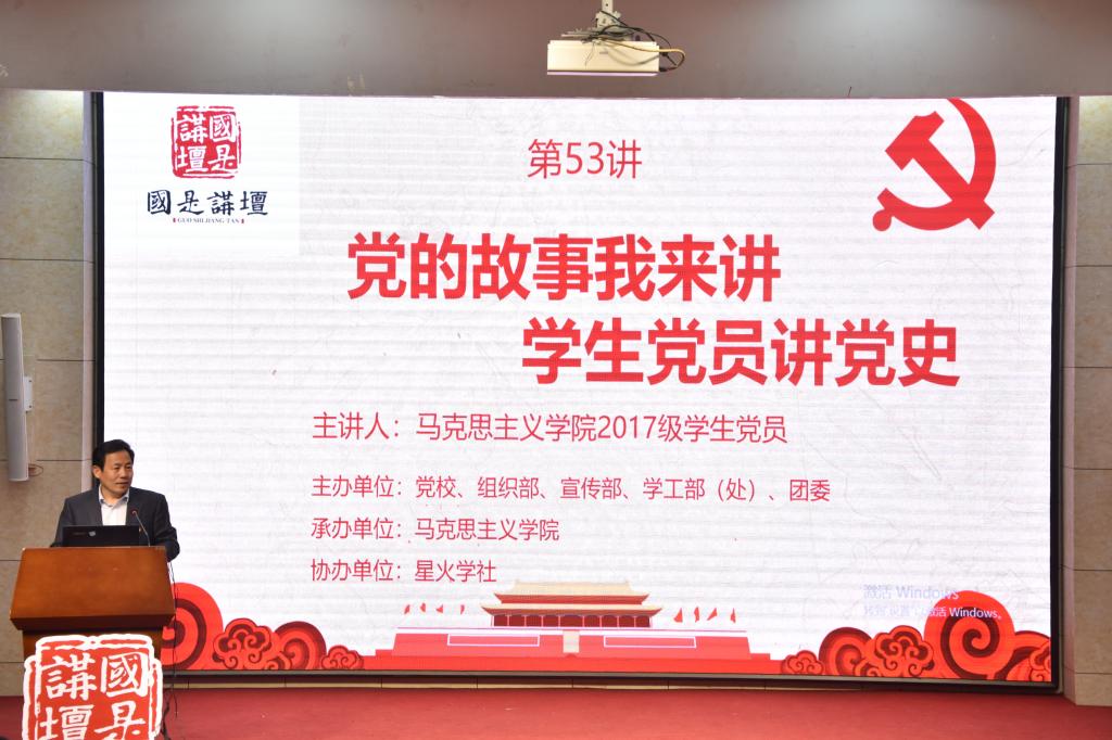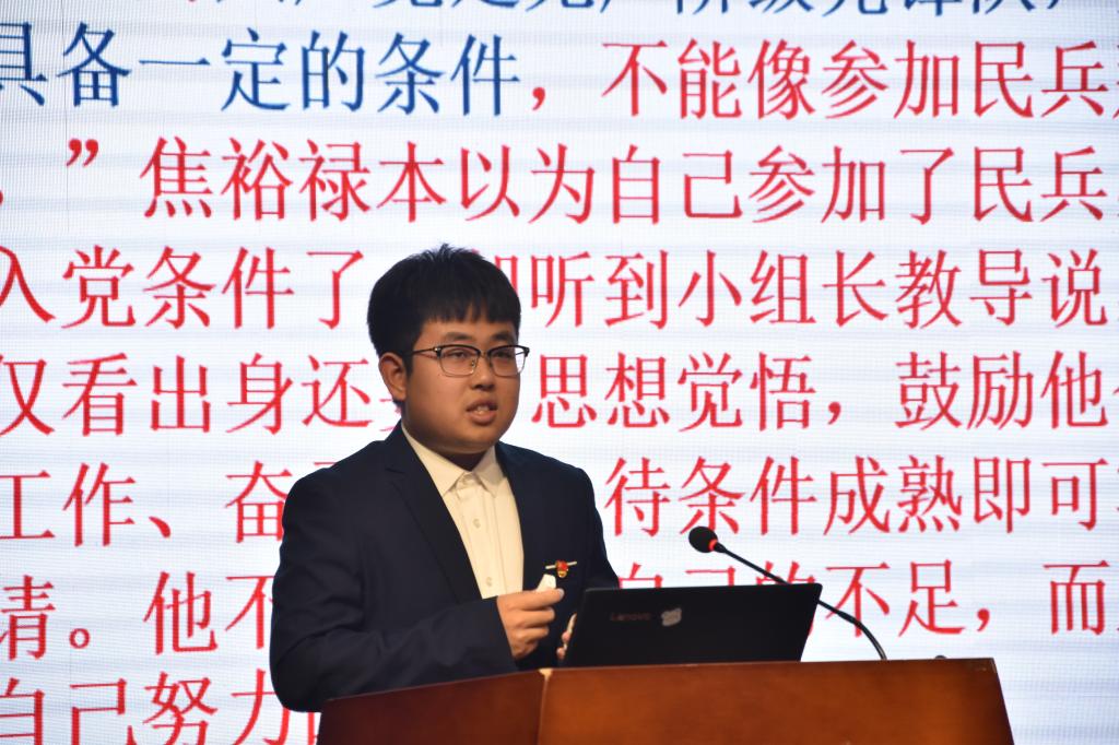 随后,马克思主义学院思想政治教育专业单滕、姜士奎、臧叶蕾、毕景玉、唐璐瑶、卢洪瀑、桑玉宁、夏晨晓等8名学生党员依次登上“国是讲坛”,饱含真情、深情和激情讲述了从中国共产党百年历史中撷取的八个经典故事,时间跨度从1921年党的建立到中国特色社会主义进入新时代。他们分别讲述了“中国最早《共产党宣言》翻译者——陈望道:真理的味道有点甜”,“中国第一个马克思主义者——李大钊:敌人可以绞死我,但绞不死伟大的共产主义”,“被敌人乱刀砍死的——陈延年:宁死不跪”,“广州南路地区最早的年仅26岁的女共产党员——钟竹筠:面对敌人的屠刀以死保守党的秘密”,“还原一个真实的抗日英雄群体——狼牙山五壮士”,“党的好干部、县委书记的模范——焦裕禄的三份入党申请书”,“两弹一星元勋——钱学森:我将尽我所能,帮助中国人民建立一个幸福而有尊严的国度”,“中国机长——刘传健:高空中为了128名乘客处惊不乱”。马克思主义学院青年教师党员刘英对8名同学所讲述的党史故事一一予以点评,指出中国共产党百年历史中蕴藏着丰富的营养,包含着无穷的智慧,无数中国共产党人用自己的毕生精力乃至生命书写了百年辉煌的历史,使中国人民站了起来、富了起来并逐渐开始强起来,我们青年一代党员当从党史中汲取智慧和力量,在学思践悟中坚定理想信念,在奋发有为中践行初心使命,赓续共产党人的精神血脉,把红色江山世世代代传承下去。