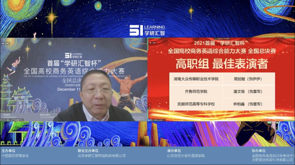 2021年首届“学研汇智杯”全国高校商务英语综合能力大赛全国总决赛成功举办,本次比赛由中国国际贸易协会、北京学研汇智网络科技有限公司主办,由全国商务英语培训与考试中心、山东财经大学外国语学院承办。
