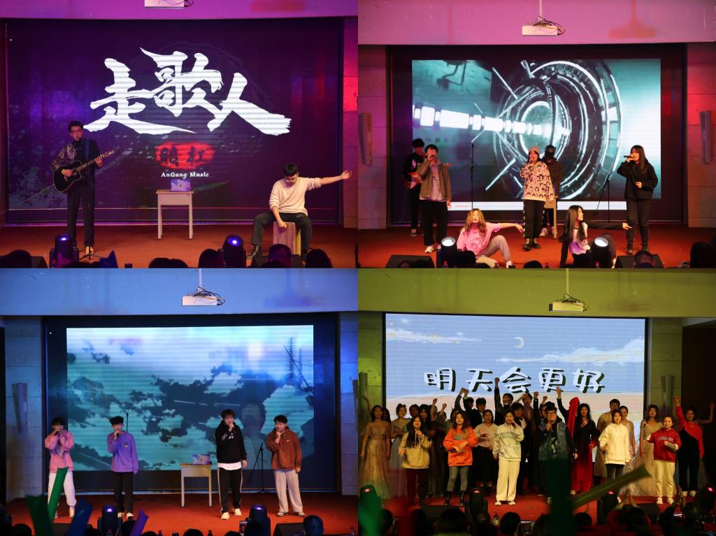 晚会在舞蹈《律动的青春》中拉开帷幕,喜庆的舞蹈烘托出祥和的气氛;张明瑞老师和21级同学们带来的《敢问路在何方》充分揭示出这种轻松、豪迈、举重若轻的人生态度,充满哲理意味;民乐合奏《拔根芦柴花》带我们走进了江苏的秧田上;小品《同学聚会》展现出同学之间的感情是最真挚的,应相互扶持,互相帮助;玩转音乐,舞动青春,歌曲联唱《漠河舞厅》等轮番登场;《灯火里的中国》歌颂了人民美好生活、歌颂了祖国的繁荣昌盛;小品《霸王别急》在欢笑声中展现出应该正确对待历史文化;器乐合奏《忆江南》烘托出中华传统文脉生生不息、赓续不断的主题;最后学院全体成员合唱《明天会更好》,表达了同学们对学院的美好祝愿。