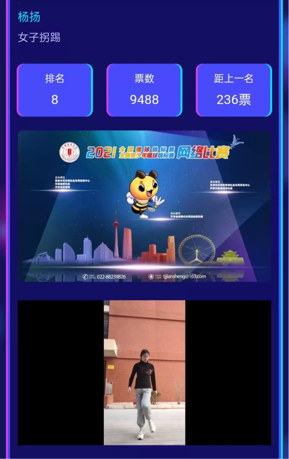 2021全国毽球锦标赛暨全国青少年毽球锦标赛网络比赛线上展演环节于2021年12月21日落下帷幕。我校毽球队派出多名优秀学生代表参赛,其中数学学院2019级数学与应用数学1班的杨扬同学在本次比赛中取得了女子拐踢赛(成人组)第六名的优异成绩,并且在展演平台中深受网友的喜爱,获得近万票的支持。