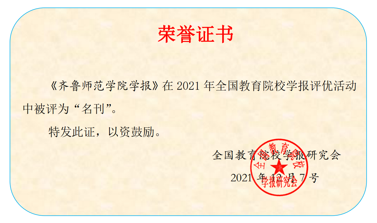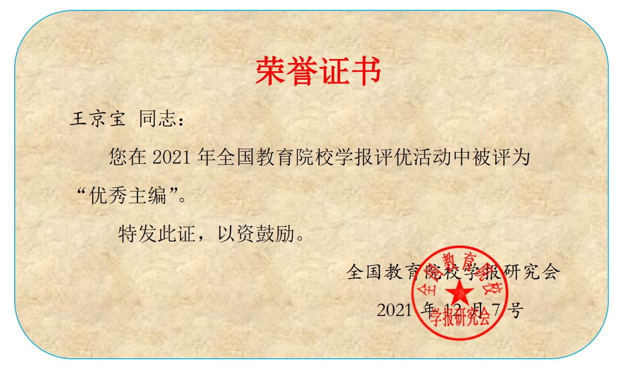 近日,在2021年全国教育院校学报评优活动中,《新利18全站app 学报》被评为全国教育院校“名刊”,学报编辑部主任王京宝被评为全国教育院校学报“优秀主编”。