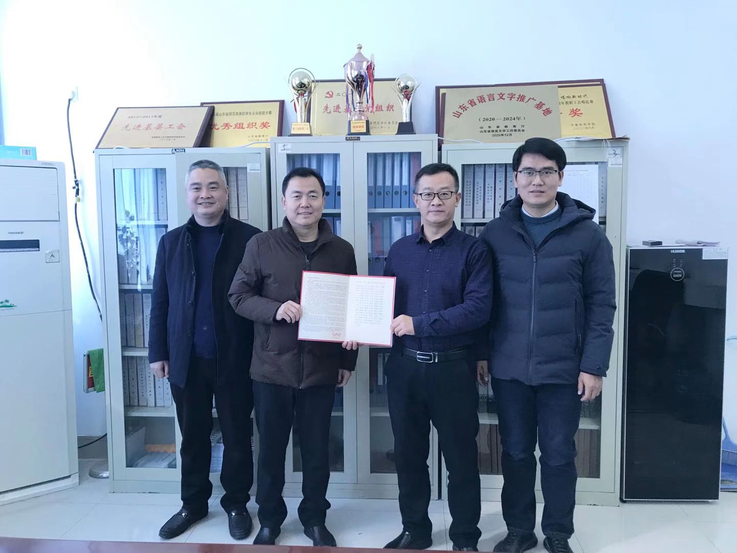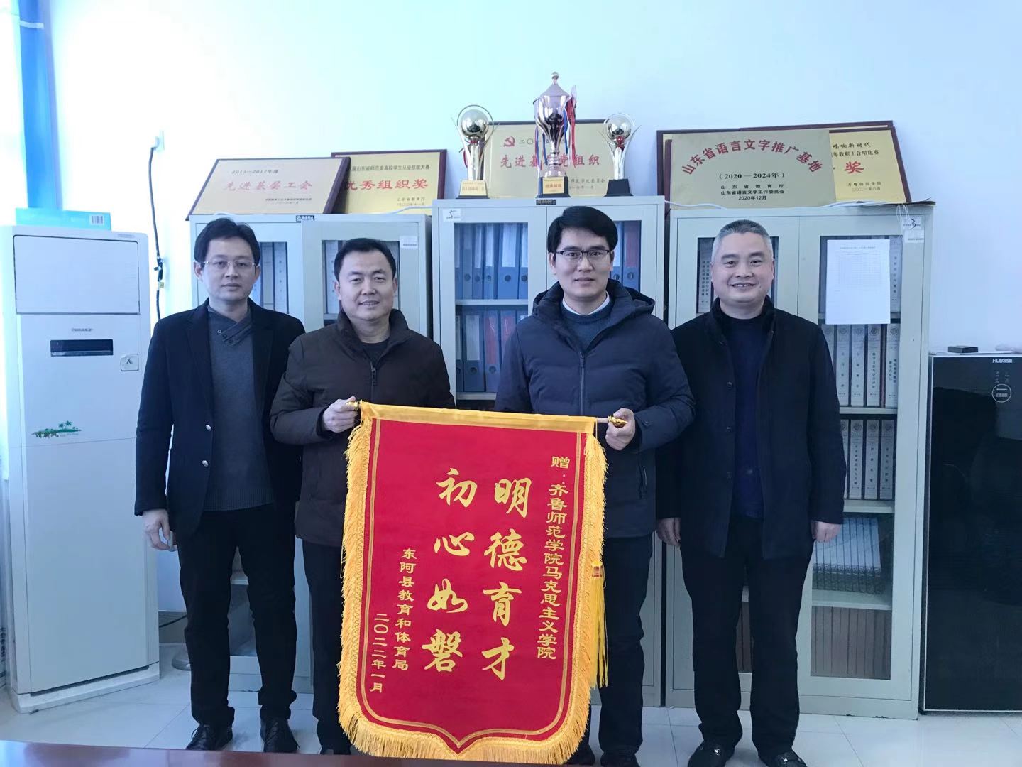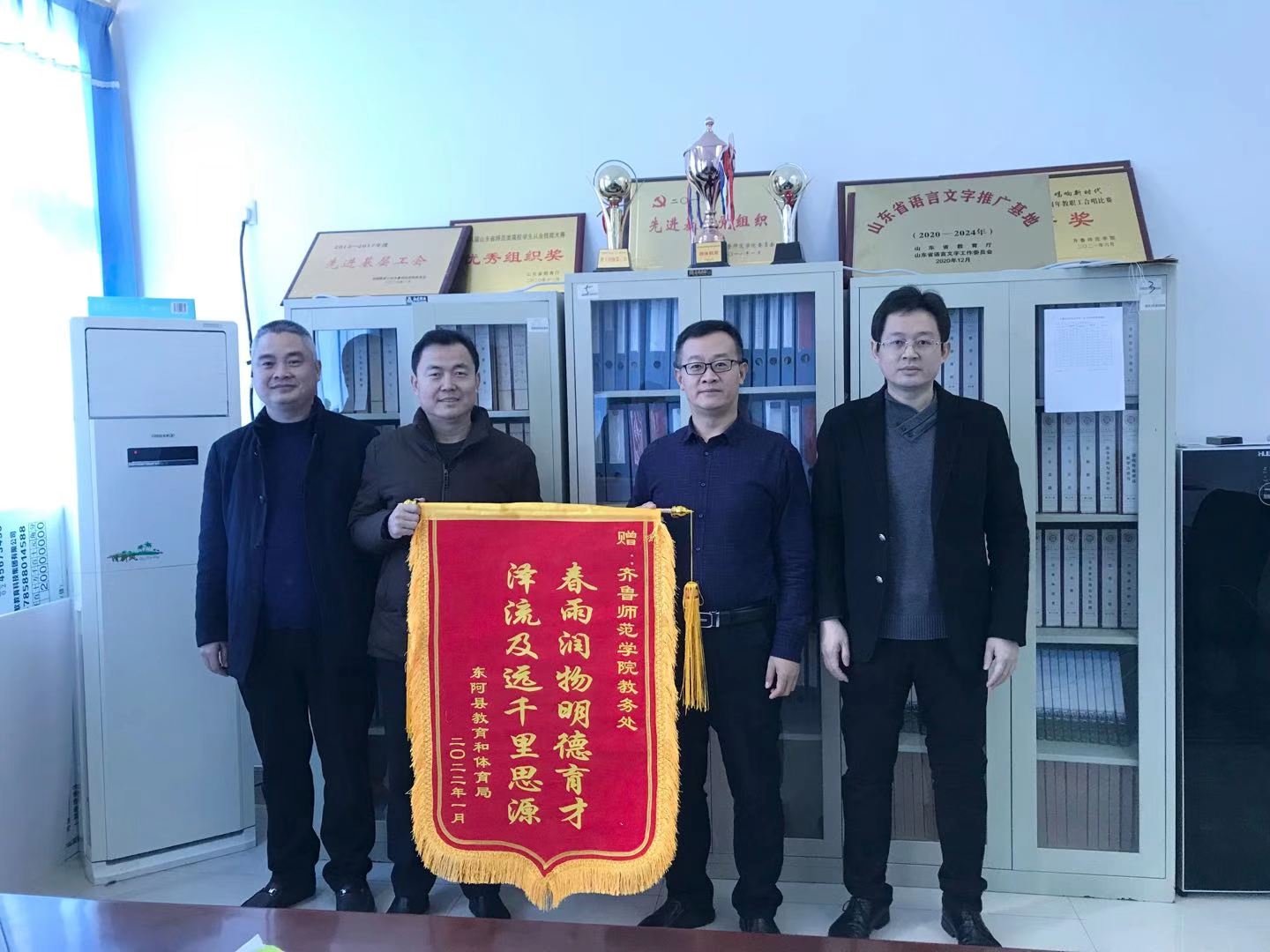 2022年1月13日上午,东阿县实验中学校长陈忠伟、实验小学校长王士军代表东阿县教体局向我校赠送锦旗及感谢信,教务处处长孙洪兆、马克思主义学院院长赵立峰接受了锦旗及感谢信,并与他们进行了亲切座谈。