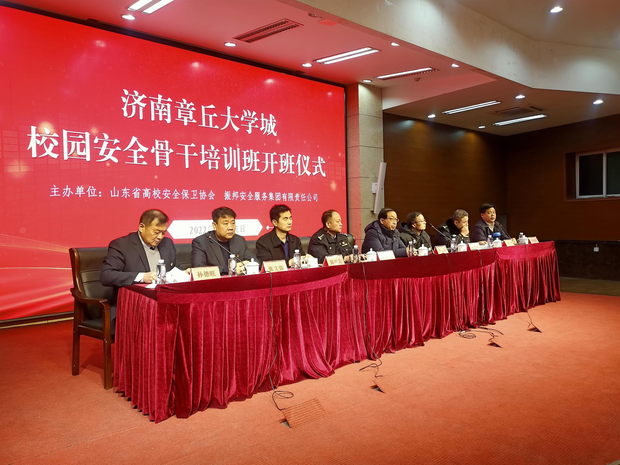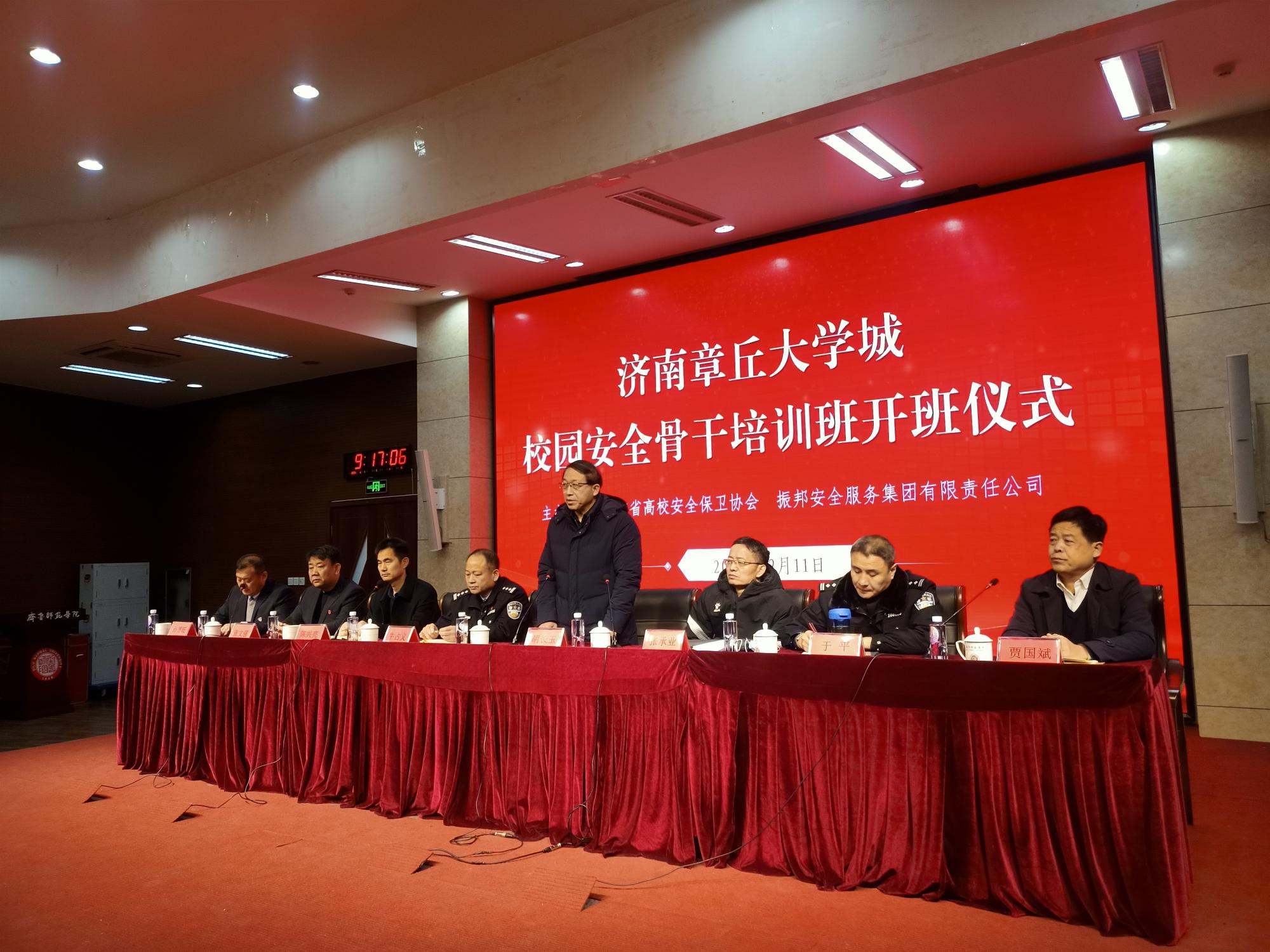 为切实筑牢校园安全防线,深入推进“护校安园”工作,全面提高校园安保人员安全防范、维护校园的安全意识和处置突发事件的能力,2月11日,济南章丘大学城校园安全骨干培训开班仪式在新利18全站app 举行,本次培训由山东省高等学校安全保卫协会和振邦安全服务集团有限责任公司联合主办。协会理事长、山东大学党委保卫部(安全管理处)处长胡长玉、山东政法学院安全管理处处长张承业、济南市公安局经文保支队三大队队长于平、章丘公安分局治安大队队长牛占义、章丘区教体局安全科科长陈兴亮、振邦安全服务集团有限责任公司副总裁张文强等出席会议。开班仪式由山东省高等学校安全保卫协会济南东片区联络培训部副部长、新利18全站app 党委保卫工作部部长贾国斌主持。