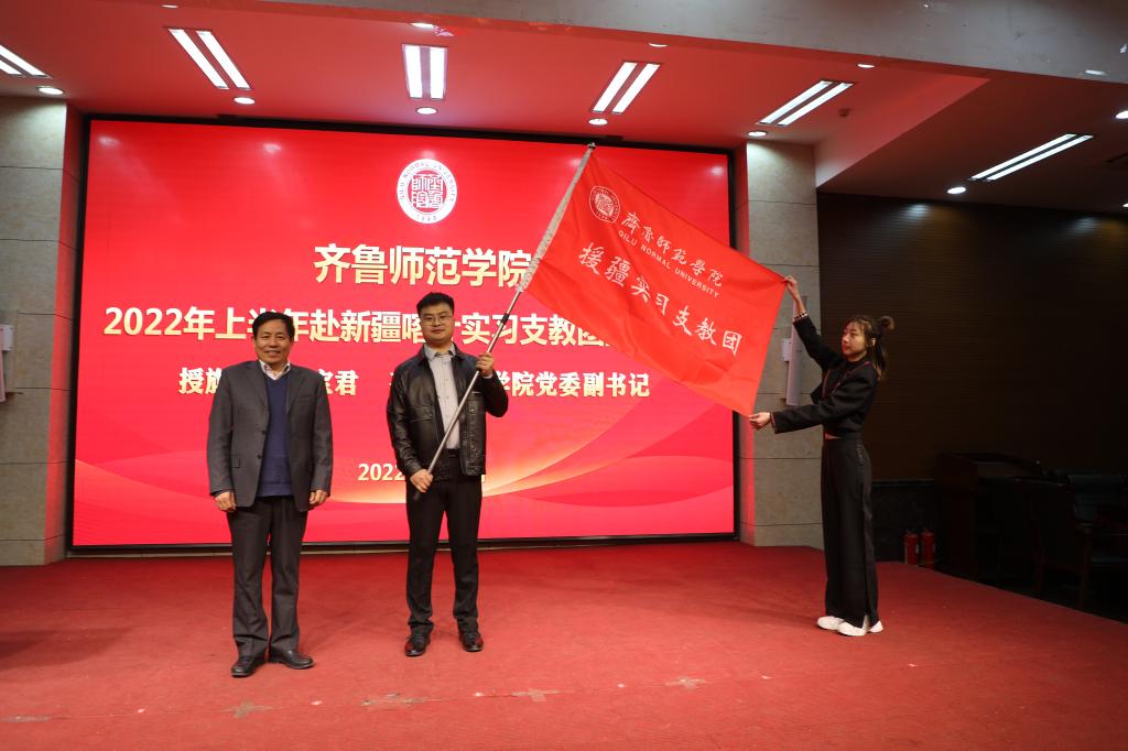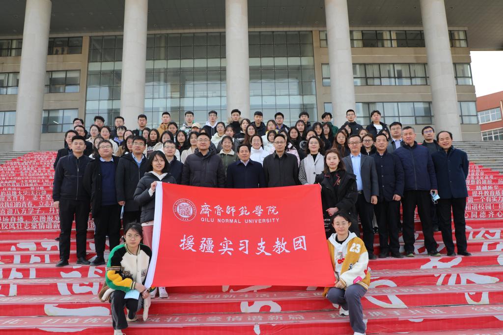 出征仪式上,刘宝君就此次援疆支教的相关方针政策进行解读并阐释了其重要意义。刘宝君代表学校党委对援疆师生积极响应党和国家号召,远赴祖国边疆无私奉献师生表示衷心感谢。学校党委、行政高度重视援疆实习支教工作。2022年年初,经山东省教育厅援疆指挥部充分酝酿,学校多次召开会议进行专题研究,经过层层选拔、严格把关,最终确定我们60名师范生奔赴新疆开展援疆支教工作。刘宝君对援疆师生提出三点希望:第一,坚定政治立场,提高政治觉悟,牢记“两个确立”,以实际行动增强“四个意识”、坚定“四个自信”、做到“两个维护”;第二,支教工作责任重大,使命光荣,要时刻牢记初心使命,忠诚党的教育事业,把自己的热情、经验等毫无保留地奉献给当地的教育工作;第三,融入当地,服从管理,用实际行动谱写民族团结的精彩华章。