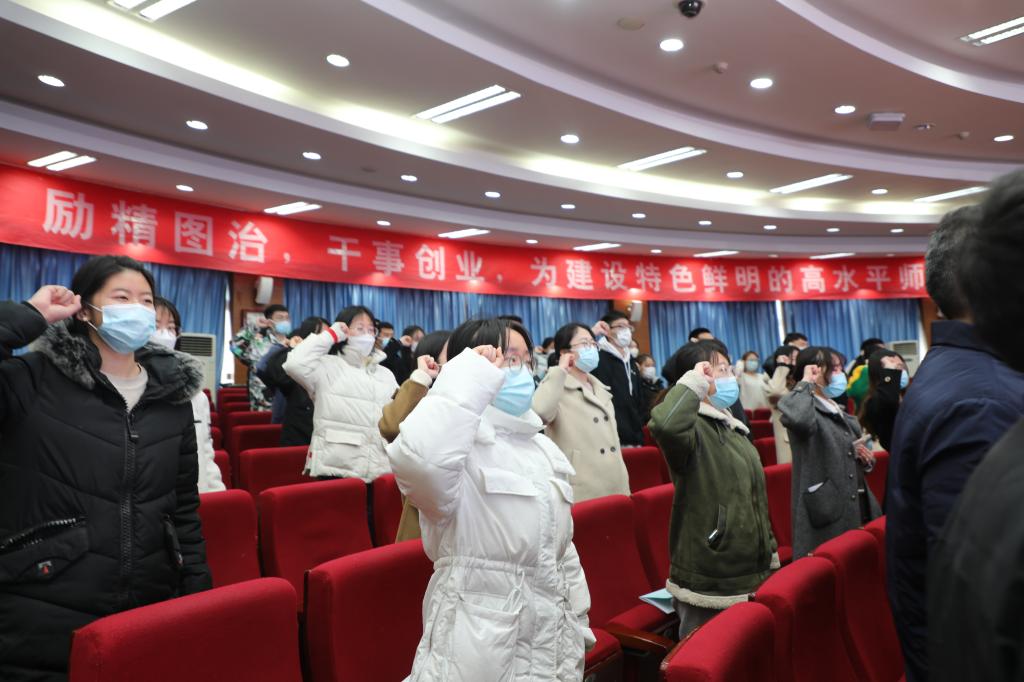 会议最后,刘宝君向赴新疆支教团授旗,领誓人王靖婷带领支教团师生进行集体宣誓。与会领导与支教团师生在图书馆前合影留念。