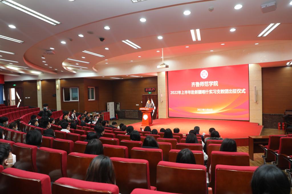 3月6日上午,新利18全站app 2022年上半年赴新疆喀什地区实习支教团出征仪式在图书馆学术报告厅隆重举行。学校党委副书记刘宝君出席仪式并讲话,党办校办、党委宣传部、学生工作部、团委、教务处负责人以及相关二级学院院长、书记,支教团全体师生参加。仪式由教务处处长孙洪兆主持。