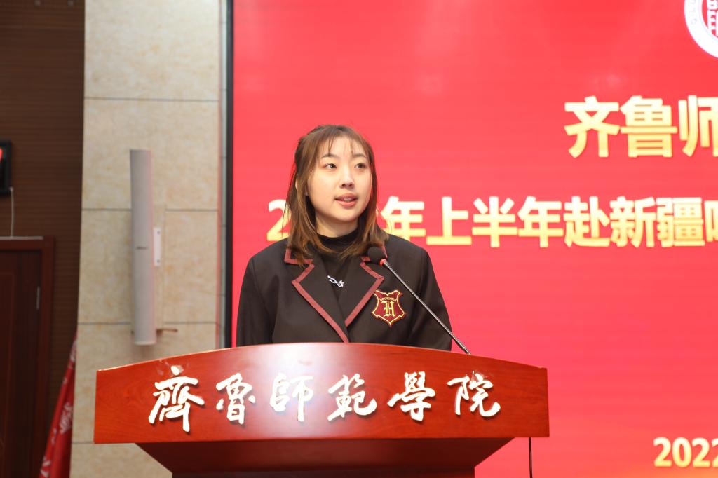 教师教育学院学生王靖婷代表全体支教团学生发言,同学们深知作为学校第一批赴疆支教成员所肩负的责任和使命,要严格遵守支教期间支教团的各项规章制度,并在踏上实习岗位之后,各方面严格要求自己,上好每一堂课,教育引导好每一名学生,努力练就自身新利18全站luck 本领。
