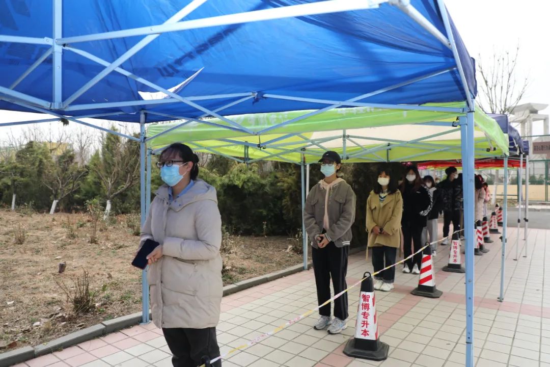 此次全员核酸检测工作以就地就近采样为原则,分为章丘、历下两个校区进行。为减少其他学生被感染风险,被隔离学生设置专门检测点。为高质高效做好此次全员核酸检测工作,学校从二级学院及其他部门单位抽调教职工进行全方位协助,校团委青年志愿者协会每天抽调十余名志愿者,在做好自身疫情防护的基础上,进行身份信息登记、查验健康码、身份信息登记、维持现场秩序等工作。学生工作部通过学生疫情防控信息群、大数据摸排等,与检测点随时沟通现场情况,精准调度安排学生错时错峰排队,并督导各学院建立“未测核酸学生台账”,压紧压实责任,实行“人盯人”工作方式,所有未测核酸学生立即分配落实到每一名辅导员,责任到人,确保无一人漏检。党办校办、人事处、安全管理处、后勤管理处、网络信息中心等部门及时提供校车运行、信息登记、通知传达、物品供应、网络保障、安全维护等服务,有效保障核酸检测工作的快速展开。