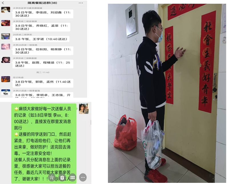 历史文化学院设立党员示范岗,充分发挥党支部的战斗堡垒作用和党员干部、教师党员的先锋模范作用,形成了党员干部积极带头引领,全体师生协作配合,深入校园疫情防控第一线的良好局面。学生党员、入党积极分子、学生干部自发成立志愿者分队,主动帮扶被隔离同学。他们第一时间成立隔离餐配送群,学生干部积极发动全体同学,安排好配送隔离餐值日表,学生们送完餐都会在群里进行反馈,真正地确保隔离同学一日三餐都能及时吃上热饭。除此之外,志愿者们还帮隔离宿舍倒垃圾,接热水等等。对于学习问题,学生干部提前联系老师,每节课都提前建立腾讯会议,让隔离学生能够在宿舍进行线上学习。某位同学说道:自从开学之后,我心里总是慌慌的,不仅仅是因为我坐的动车途经了青岛的三个区县,说不害怕那是假的,但是同学们的关心、老师的贴心、还有隔离舍友的热心驱赶了内心的恐惧与烦躁。隔离期间,每天也是按部就班的生活与上课,除了不能外出一切安好。”历史文化学院党员服务站赵凯雯说:“此次疫情来势汹汹,作为学生干部,我积极响应号召,利用好信息传送网络,第一时间帮助老师摸排学生信息、购买物资、组织志愿者轮流为隔离宿舍送饭送水,开通24小时服务咨询热线,落实疫情期间全天24小时在岗应答机制。这次疫情让我看见了学校老师舍小家为大家的高尚情怀,看见了优秀党员干部、志愿者冲锋在前的担当……我相信国家的力量,只要大家一起努力就一定能渡过难关!