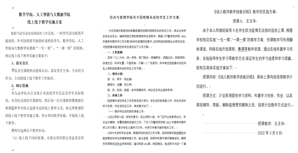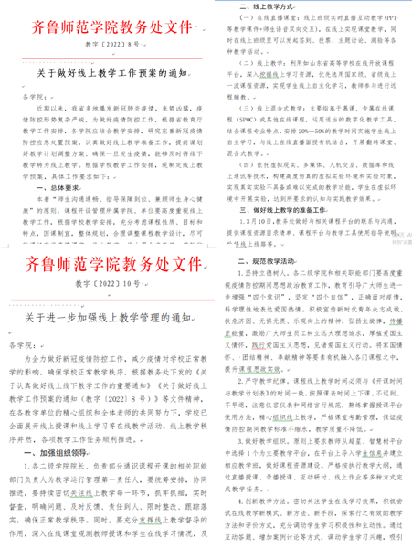 高度重视、统筹谋划。教务处根据疫情发展态势,反复研讨,科学制定应急预案及相关处置措施,确保全校教学工作有序顺利开展。教务处先后制定了《关于做好2021-2022学年度第二学期开学初教学准备和教学检查工作的通知》《关于认真做好线上线下教学工作的重要通知》《关于做好线上教学工作预案的通知》《关于进一步加强线上教学管理的通知》《线上教学网络拥堵解决方案》等通知。本着“师生沟通通畅、指导保障到位、兼顾师生身心健康”的原则,依托线上平台,综合运用在线课程教学平台、网络直播等在线教学工具,全面落实疫情防控期间学校教学工作,实现线上线下教学即时切换,确保教学工作平稳有序运行。