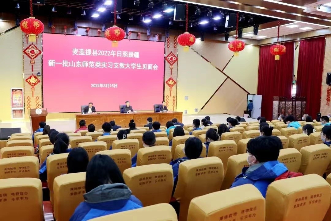 3月15日上午,麦盖提县2022年日照援疆新一批山东师范类实习支教大学生见面会于麦盖提县第四中学学术报告厅隆重召开,新利18全站app 援疆实习支教团全体师生参加会议,此次会议也标志着我校选派的59名实习支教大学生肩负使命,正式走上工作岗位。麦盖提县委副书记、日照援疆指挥部党委书记、指挥谢霁晓出席并讲话,县委常委、组织部部长杨青仓致欢迎辞并介绍了麦盖提县的基本情况和教育发展情况,县政协党组成员、教育局局长玉苏甫•买合苏提主持。