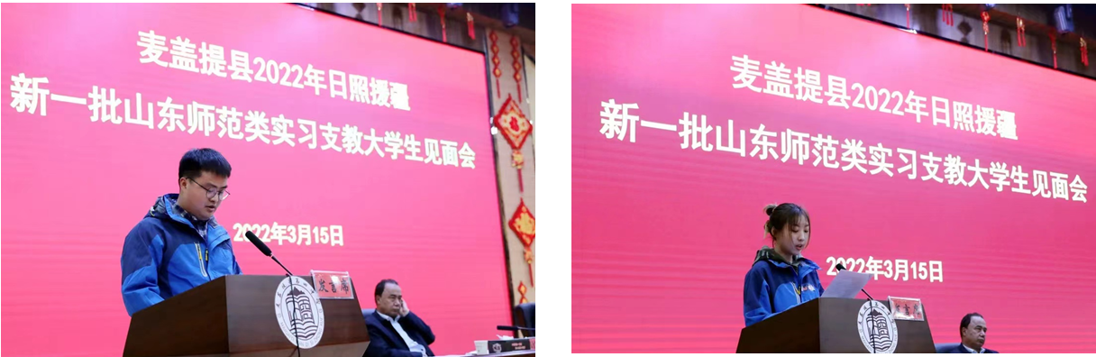 我校援疆实习支教带队教师王亚东和实习支教大学生代表王靖婷分别表态发言,决心牢记初心使命,遵规守纪,尽职尽责,在麦盖提县这片热土发挥自己的专业特长,勇担援疆使命,展现青春风采,为新疆喀什麦盖提县教育事业发展贡献智慧力量。
