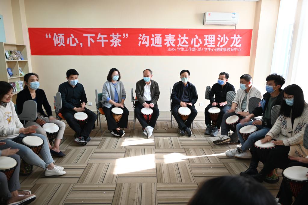 活动在“很高兴认识你”的破冰活动中拉开序幕。畅所欲言、互诉心情,沟通交流、传递温暖,师生们在活动中相互分享疫情期间的心理变化和情绪状态,为彼此加油打气、关照安抚。外国语学院辅导员王伟提到,自己作为一名年轻辅导员在疫情开始时也有过焦虑、有过困惑,但在学校领导的坚强领导下,心态坚定下来,深刻体会了作为一名辅导员在疫情防控工作中身上的责任与担当,更为自己在学生疫情防控工作中得到的历练、成长感到自豪和欣慰;历史文化学院学生胡颖分享了自己由开始的焦虑恐慌,到后来的坦然面对,再到现在安心学习和愉悦生活的心路历程,她认为这些变化都离不开学校和老师的温暖关怀,是老师和同学的陪伴与支持,让她不再担心、害怕。正念减压冥想、“感受生命的能量”、情绪稳定化技术“蝴蝶拍”等活动,让参与师生舒缓了身心,缓解了情绪,获得了能量,活动在欢快的非洲鼓演奏中圆满结束。
