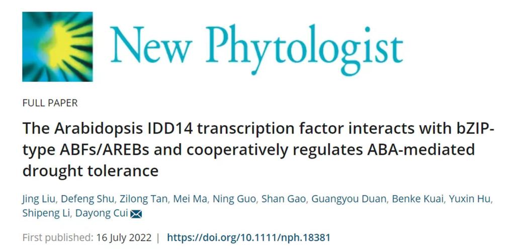 近日,我校生命科学学院植物学研究团队,在国际著名学术期刊《New Phytologist》(全球植物科学SCI杂志排名8/238,中科院生物学1区TOP期刊,IF:10.323)上在线发表了题为“The Arabidopsis IDD14 transcription factor interacts with bZIP-type ABFs/AREBs and cooperatively regulates ABA-mediated drought tolerance”的高水平研究论文,发现植物特有转录因子IDDs作为新的脱落酸(ABA)信号转导组分,与ABFs协同调控了干旱胁迫应答反应。