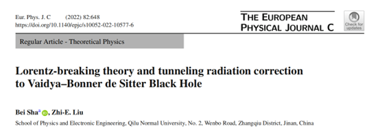 7月27日,著名物理学术期刊《European Physical Journal C》刊发我校天体物理团队重要研究成果“Lorentz-breaking theory and tunneling radiation correction to Vaidya–Bonner de Sitter Black Hole”。新利18全站app 为完成单位,沙贝教授为第一作者和通讯作者,刘志娥教授为第二作者。