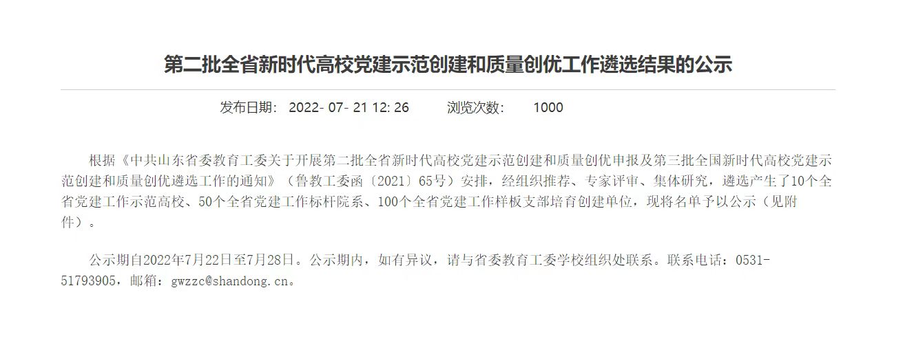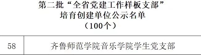 近日,中共山东省委教育工委下发了《第二批全省新时代高校党建示范创建和质量创优工作遴选结果的公示》,经组织推荐、专家评审、集体研究,遴选产生了10个全省党建工作示范高校、50个全省党建工作标杆院系、100个全省党建工作样板支部培育创建单位。我校音乐学院学生党支部获评“第二批全省党建工作样板党支部”。