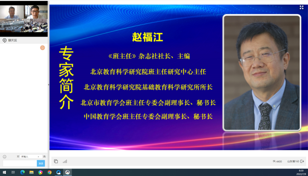 7月6日至9日,培训邀请了齐学红、赵福江、秦蓁和郭春飞四位专家采取同步在线的方式围绕“立德树人”背景下的班级建设理论与实践、班级管理的理念与策略、主题班会课的设计与实施、班主任的专业成长知识与修养做了专题讲座,参训人员以学校单位组织开展了集中学习和现场研讨活动。