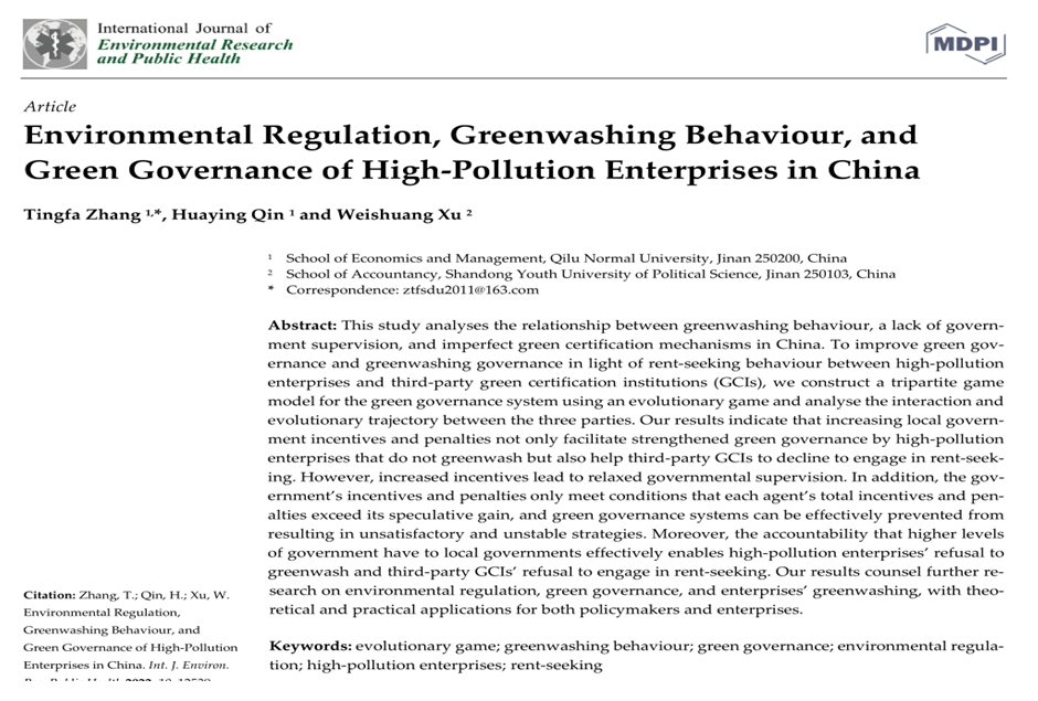 近日,经济与管理学院张庭发教授团队的研究成果“Environmental Regulation, Greenwashing Behaviour, and Green Governance of High-Pollution Enterprises in China”在国际知名期刊International Journal of Environmental Research and Public Health(SSCI一区,五年影响因子4.798)2022年第19卷在线发表,新利18全站app 为第一作者和通讯作者单位。