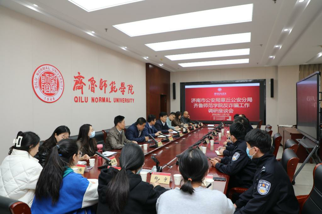 11月7日,派驻警务室高级警官景年文邀请章丘区公安分局刑警大队政委许子锋一行深入学校调研座谈反诈骗工作,与师生面对面进行形势通报、业务培训。