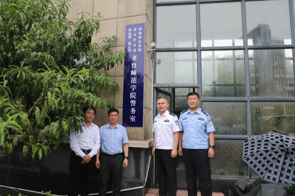 2022年8月10日,学校党委委员、副校长李伯伟与济南市公安局经济文化保卫支队朱容海支队长、章丘区公安分局和双山第二派出所领导共同为警务室揭牌。