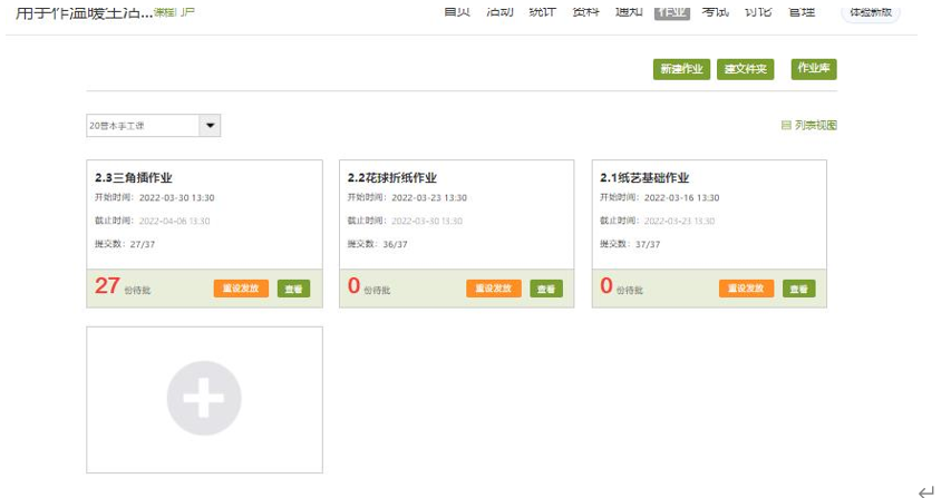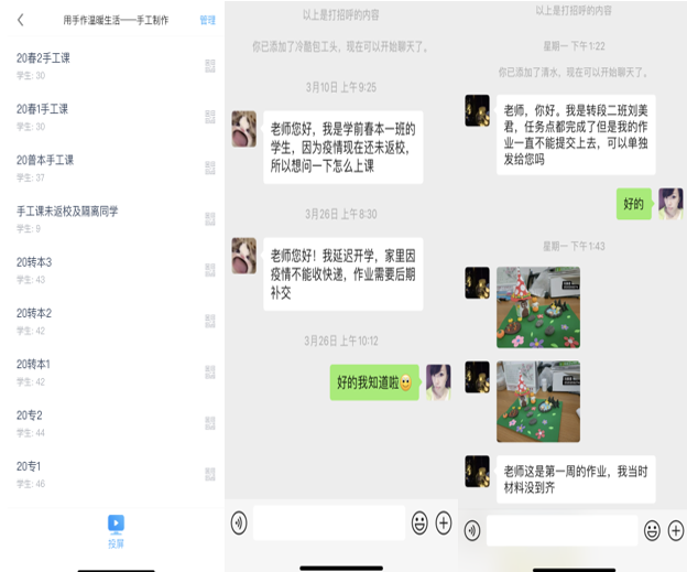 结合课程特点,学生在进行本课程的学习前需提前准备手工材料和工具(如彩色纸、超清黏土、剪刀、胶等),但近三周部分学生由于特殊原因无法及时准备手工材料和工具,鉴于以上特殊情况任课教师进行了学生情况摸底。首先,为未返校和隔离学生单独新建在线学习班级。其次,对于因为疫情无法进行材料准备的学生放宽作业提交时限并适当降低作业要求。